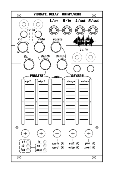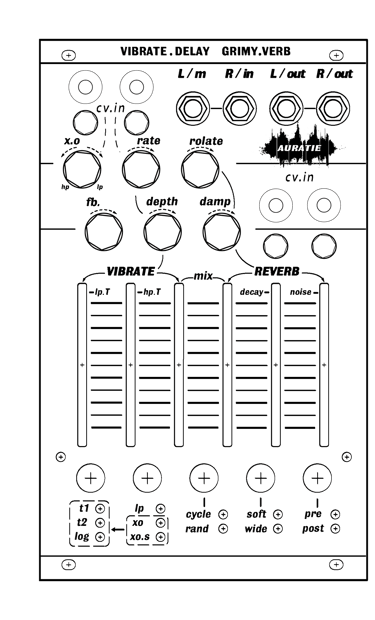 AURATIE aims to explore the extension of single tones into the stereo realm. It transforms simple sounds into expansive and reshaped experiences, making it particularly effective for designing drone soundscapes. The interaction between vibrate and delay creates unique feedback with different delays and frequency changes across the left and right channels. The reverb’s gritty design, combined with the vibrate interaction, allows for intriguing experimentation, enabling users to switch the positions of the two parts for further exploration.